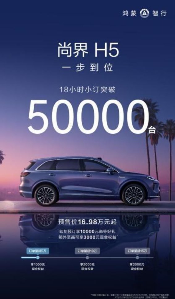 2025-09-01 来源:本站8月25日,尚界H5正式开启预售,并以其16.98万元起的震撼价格和强大的智能配置吸引了众多消费者的关注。在短短18小时内,尚界H5的订单量就突破了50000台,这一数据不仅展现了市场的高度认可,也凸显了尚界H5强大的竞争力。凭借着“拼好车”的现金补贴政策,尚界H5掀起了一场价格与权益的全民大战,消费者不仅享受到了降价福利,更见证了一款具备巨大市场潜力的车型诞生。